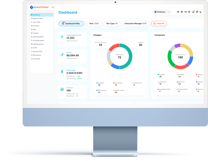 EvGateway Electric Vehicle Charging Network (EVCN) for Fleet and a Public charging monitors the health of the Charging Station equipment, activates, and terminates charging events, initiates pay as you go transactions and collects usage data from charging stations.
